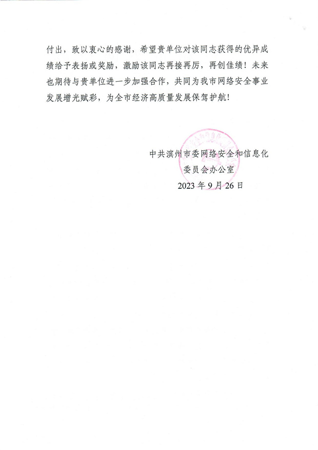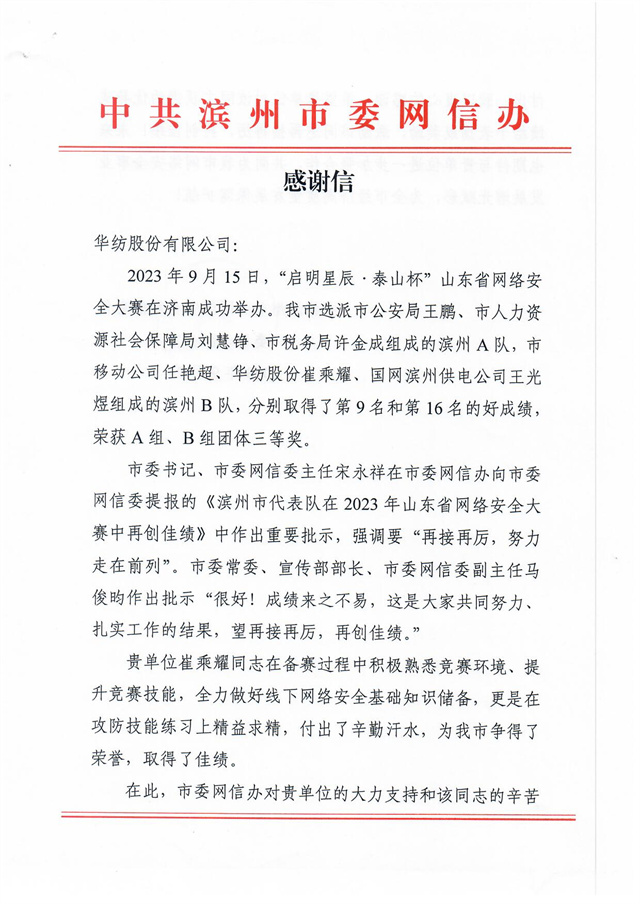 近日,公司收到一封來自濱州市委網(wǎng)信辦的感謝信,信中高度肯定了公司互聯(lián)信息部信息中心信息安全管理員崔乘耀在2023年9月15日“啟明星辰·泰山杯”山東省網(wǎng)絡安全大賽中所做出的突出貢獻,信中指出:“貴單位崔乘耀同志在備賽過程中積極熟悉競賽環(huán)境、提升競賽技能,全力做好線下網(wǎng)絡安全基礎知識儲備,更是在攻防技能練習上精益求精,付出了辛勤汗水,為我市爭得了榮譽,取得了佳績。”
