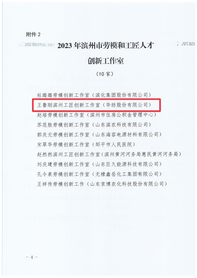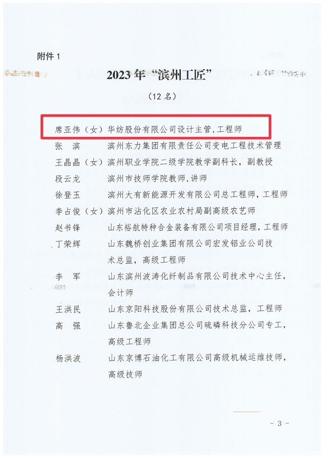 近日,濱州市總工會下發(fā)了《關(guān)于公布 2023 年濱州工匠濱州市勞模和工匠人才創(chuàng)新工作室的通知》,公司家紡研發(fā)部設(shè)計主管、工程師席亞偉榮獲2023年“濱州工匠”稱號、王魯剛工匠人才創(chuàng)新工作室榮獲“濱州市勞模和工匠人才創(chuàng)新工作室”榮譽。