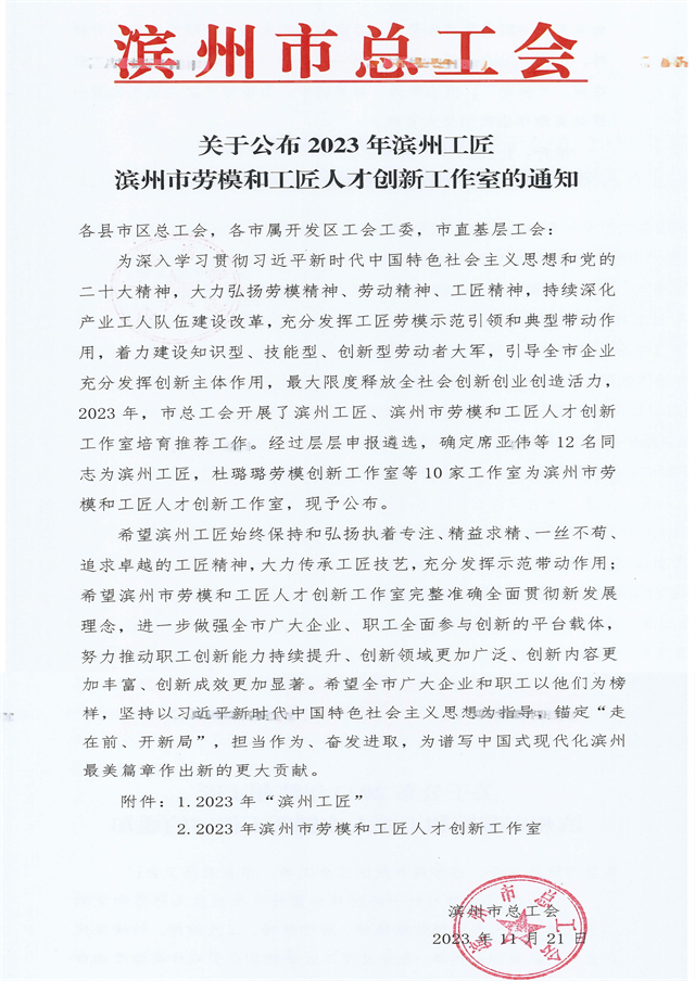導(dǎo)讀:近日,濱州市總工會下發(fā)了《關(guān)于公布 2023 年濱州工匠濱州市勞模和工匠人才創(chuàng)新工作室的通知》,