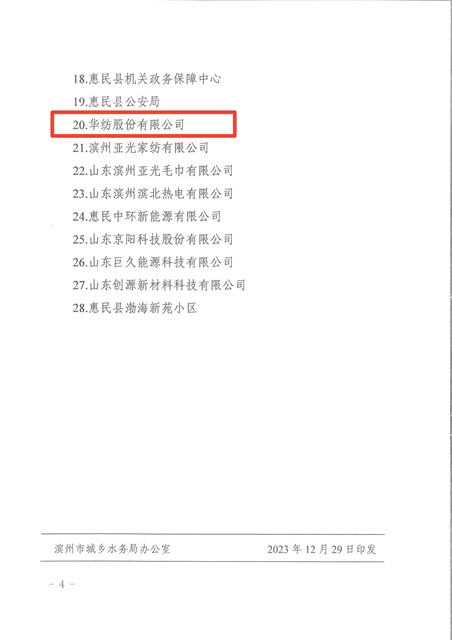 2023年,在全國紡織行業(yè)綠色發(fā)展勞動競賽中,公司榮獲節(jié)水標(biāo)桿企業(yè);在濱州市創(chuàng)建國家節(jié)水型城市省級復(fù)查工作中,公司高質(zhì)量、高標(biāo)準(zhǔn)完成各項工作任務(wù),為順利通過省級復(fù)查奠定了基礎(chǔ)。