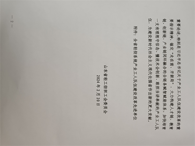 近日,省輕工紡織工會(huì)三屆四次全委會(huì)暨全省輕紡系統(tǒng)產(chǎn)業(yè)工人隊(duì)伍建設(shè)改革推進(jìn)會(huì)議在濟(jì)南召開(kāi)。會(huì)上公布了全省輕紡系統(tǒng)產(chǎn)業(yè)工人隊(duì)伍建設(shè)改革先進(jìn)單位名單,公司工會(huì)委員會(huì)名列其中。